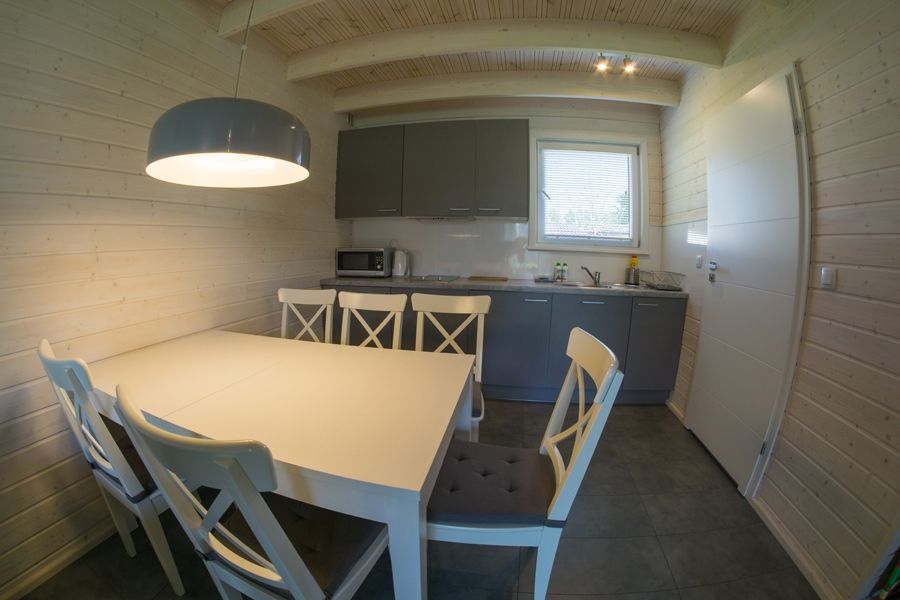• domki dwupoziomowe: dół salon z kuchnią oraz łazienką, góra dwie sypialnie, dwa tarasy na górze i na dole. Wyposażone są w: lodówkę, kuchnię, czajnik bezprzewodowy, szklanki, talerze, leżaki plażowe, wi-fi, telewizor oraz pralka