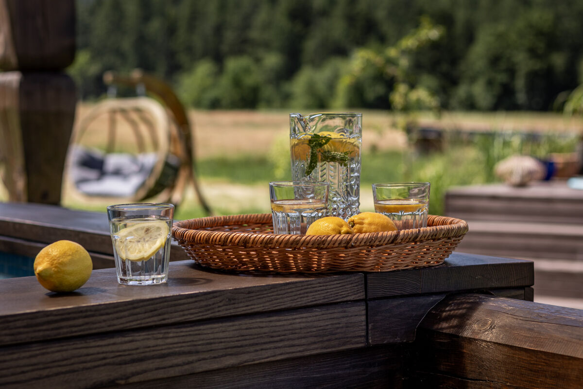 * zadaszony taras widokowy wokół całego salonu, na którym znajdują się meble do wypoczynku;