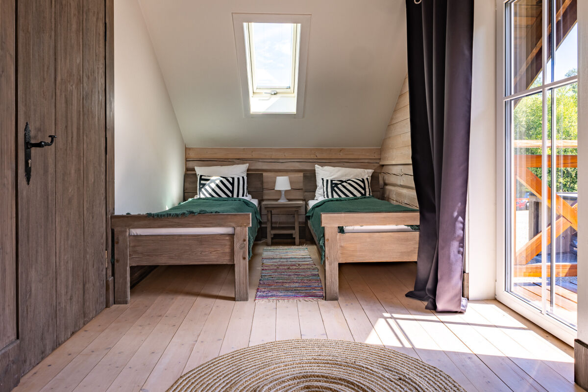 * 4 apartamenty z łazienkami - dla max. 15 osób (3 apartamenty na piętrze - w każdym łóżko podwójne i dwa pojedyncze oraz 1 apartament na parterze - z łóżkiem podwójnym i jednym pojedynczym);