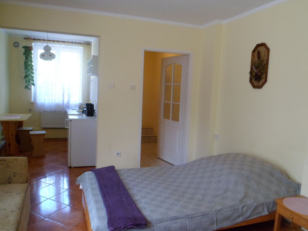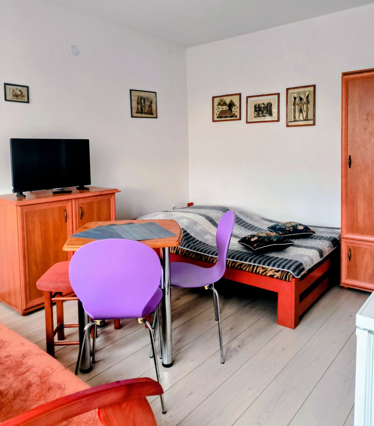 Na parterze znajduje się aneks kuchenny wyposażony w kuchenkę elektryczną, kuchenkę mikrofalową, zlewozmywak oraz podstawowe naczynia. Aneks służy głównie do podgrzewania posiłków, szczególnie dla dzieci, i nie jest przeznaczony do przygotowywania pełnych dań obiadowych. Do dyspozycji gości jest również telewizor oraz internet Wi-Fi.