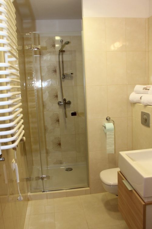 Łazienki wyposażone są w kabiny prysznicowe, bidety, a do dyspozycji Gości są: komplet ręczników, pościel oraz obrusy.