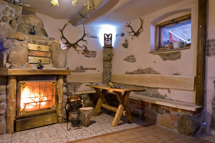 Miejscem niezwykle kuszącym do wieczornych posiadówek (szczególnie w zimowe wieczory) jest nasz hol z bardzo efektownym, jedynym w swoim rodzaju kominkiem, w którym ogień prawie nigdy nie gaśnie