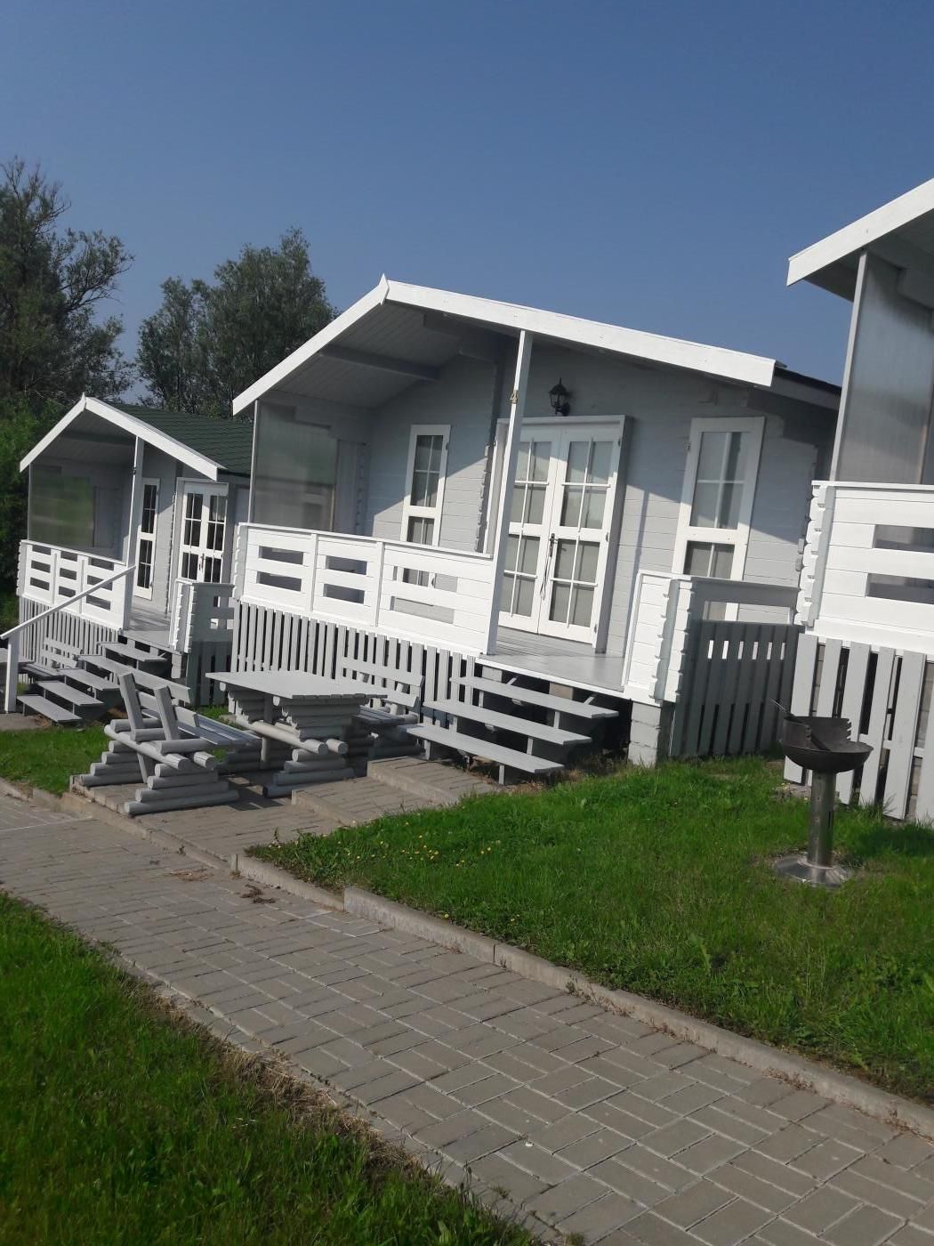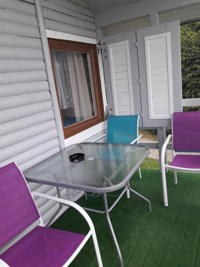 W każdym domku: TV, leżaki, parawan, grill, zestaw mebli ogrodowych.