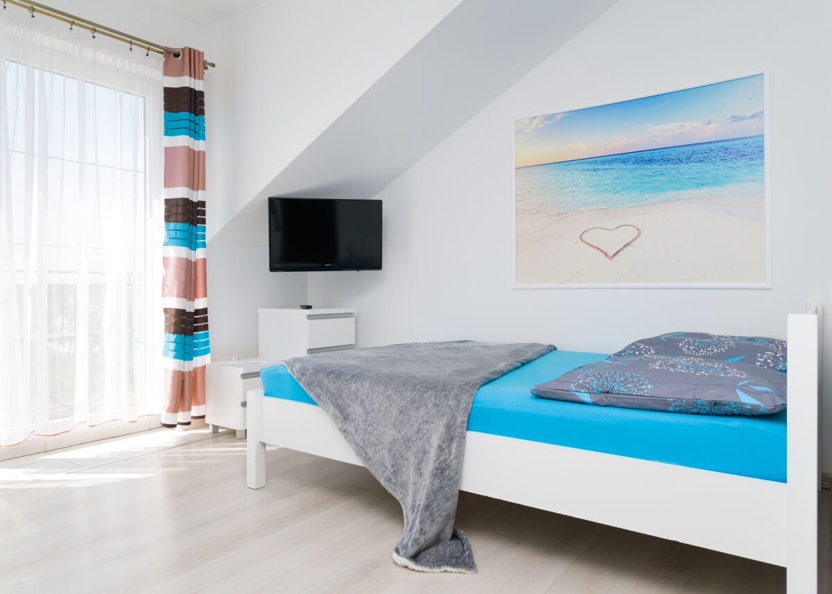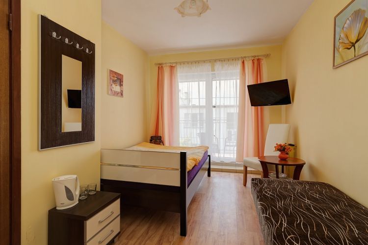 Posiadamy basen z podgrzewaną wodą, pokoje 1, 2, 3, 4, 5 osobowe z łazienkami, pokoje typu studio z balkonami lub tarasami, TV.