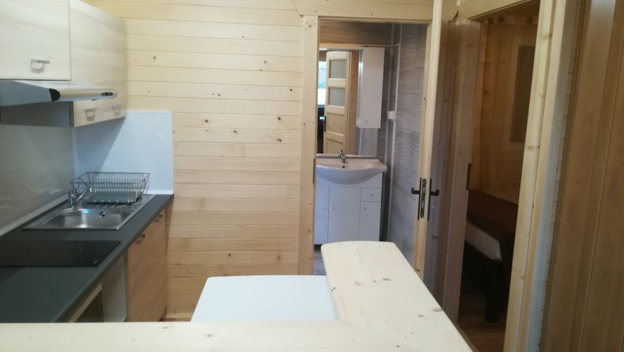 Parter domku składa się z salonu w którym znajduje się część wypoczynkowa z TV oraz jadalnią. W drugiej części usytuowano aneks kuchenny wyposażony w lodówkę, mikrofalę, kuchenkę ceramiczną, zlewozmywak, z szeregiem użytecznych szafek z zastawą dla 8 osób. Dalej znajduje się pokój sypialny dla dwóch osób z dużym łóżkiem. Obok łazienka z WC, natryskiem i umywalką. Na pierwsze piętro prowadzą schody do dwóch sypialni, gdzie znajdują komody, szafki nocne i kolejne 4 łóżka.