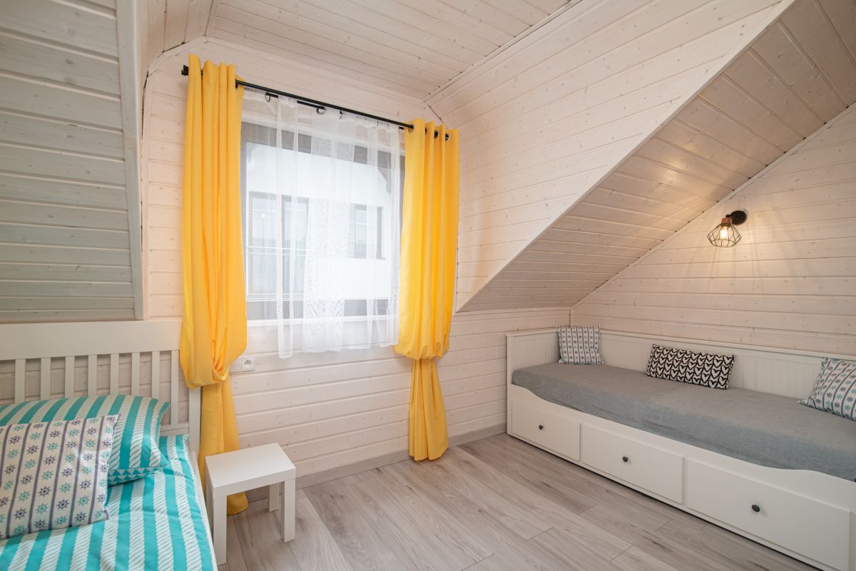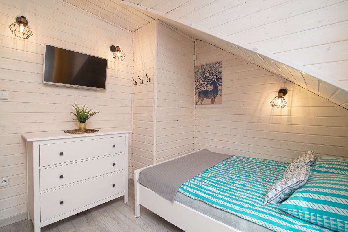 - Pokoje (łoże małżeńskie, szafa, stolik, krzesła, TV, parawan, pościel, lampki nocne);