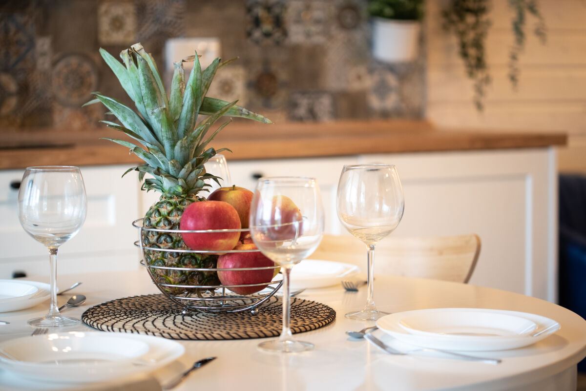 - Aneks kuchenny (kuchenka z płytą indukcyjna, okap, czajnik, lodówka, mikrofalówka, zmywarka, naczynia, garnki, patelnia, sztućce, stół z krzesłami.