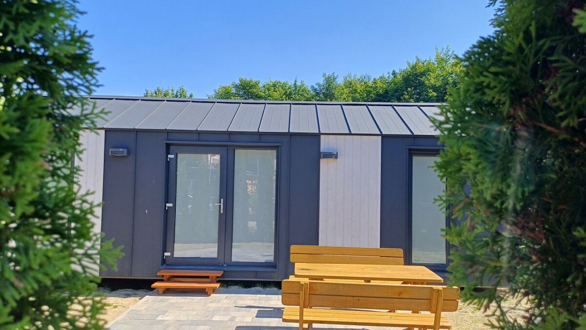 DOMKI LETNISKOWE PARTEROWE - 4 osobowe, max. 6 osobowe, dwupokojowe, aneks kuchenny: lodówka, kuchenka, 2 pokoje: -mniejszy (łóżko 2-osobowe typu wersalka) -większy z aneksem kuchennym, wejście otwarte z przedpokoju (2 łóżka 2-osobowe typu wersalka), łazienka, taras zadaszony, stół z ławami oraz grill. Na zewnątrz plac zabaw dla dzieci, ściana wspinaczkowa, bramki. Parking bezpłatny przed domkami
